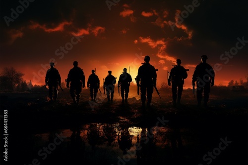 Soldiers silhouettes, guarding in Dusks Defenders, under the enchanting sunset