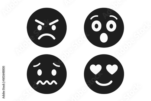 Solid black emoticon vector icon set. Expressive emoji faces with various emotions: angry, surprised, anxious, love. Simple minimal smiley character head collection.