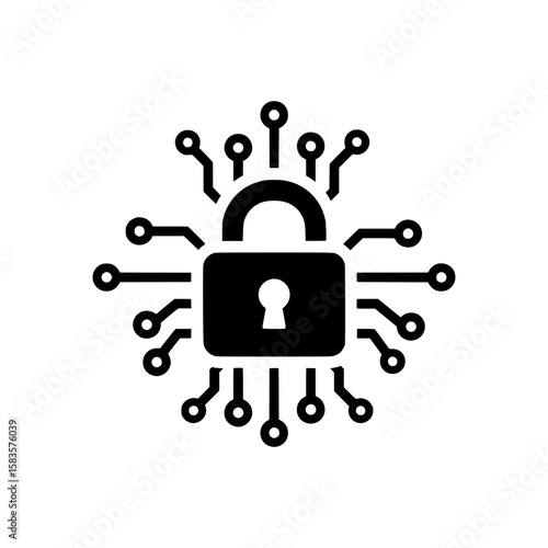 Solid Black Icon of Cybersecurity Represented by a Padlock with Electronic Circuits Around