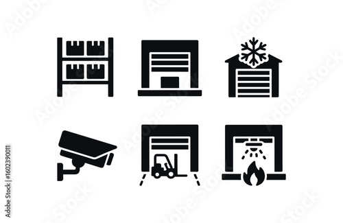 solid icon isolated storage facility rack system storage facility loading dock storage facility climate control storage facility security camera storage facility forklift lane storage