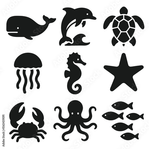 Solid Marine Icons. Solid style icons of marine animals: whale silhouette, dolphin jumping, sea turtle, jellyfish icon, seahorse