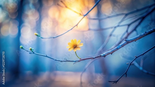 Solitary Blossom on a Branch at Dawn's Golden Hour, a Serene and Peaceful Nature Scene