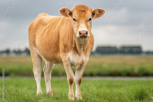 solitary cow standing gracefully in lush green field with clean blurred horizon in background
