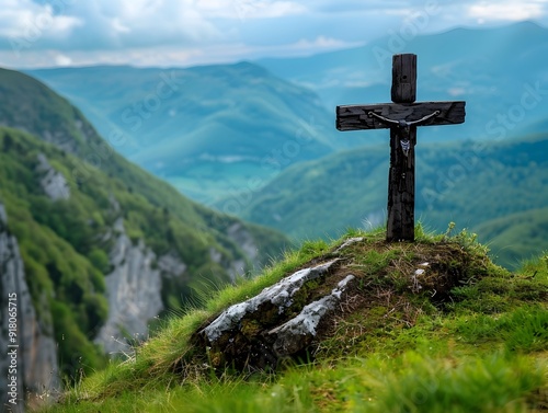 Solitary Cross on a Hilltop Overlooking a Peaceful Valley Landscape