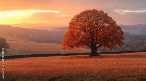 Solitary deciduous tree ablaze in warm golden light in a rural landscape at dawn or dusk.