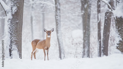 Solitary Deer Standing Peacefully In Snowy Forest Landscape With Snow-covered Trees Under Winter Sky