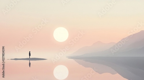 Solitary Figure at Sunrise Over Calm Water and Mountains