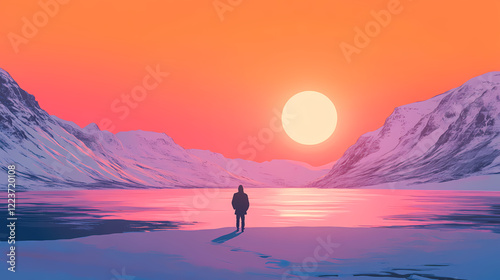 Solitary figure at sunset over fjord. Sunset Fjord. Illustration