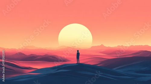 Solitary Figure Contemplates Vast Desert Sunset Landscape