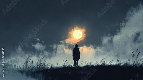 Solitary Figure Gazing at a Setting Sun Over Grasslands