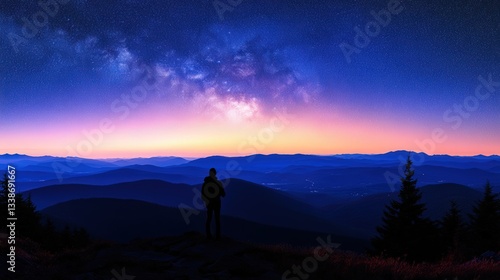 Solitary figure gazing at dusk over majestic mountains remote landscape nature photography tranquil environment wide view