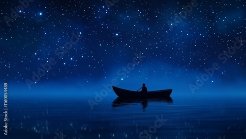 Solitary figure in a rowboat on a calm, starlit lake at night.