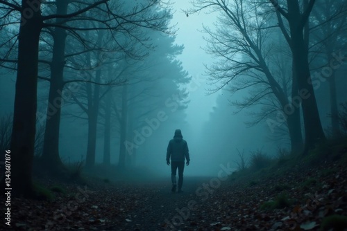 Solitary figure in foggy forest with misty surroundings and eerie atmosphere, foggy forest, misty surroundings, wilderness