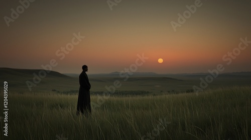 Solitary figure in tall grass at sunset, overlooking a vast landscape.