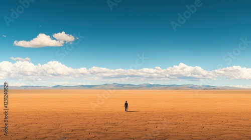 Solitary Figure in Vast Desert Landscape Under Clear Blue Sky