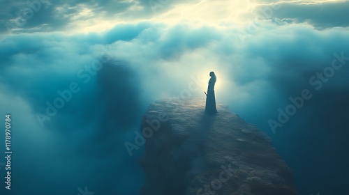 Solitary figure on a clifftop, amidst a sea of clouds, bathed in ethereal light.