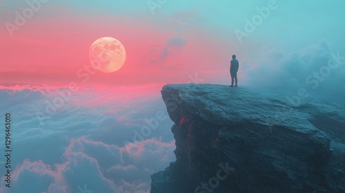 Solitary Figure on a Clifftop at Sunset with a Large Pink Moon and a Sea of Clouds