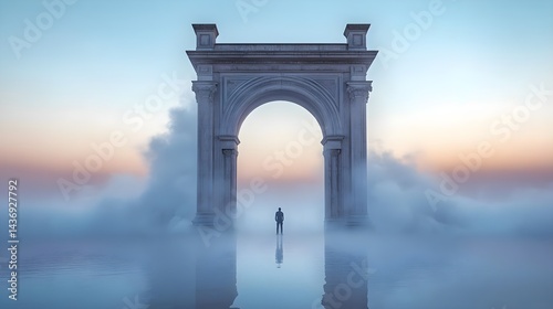 Solitary Figure Standing Before Majestic Concrete Archway at Dawn