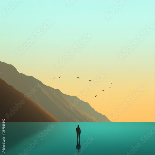 Solitary figure standing waist deep in calm water facing mountains