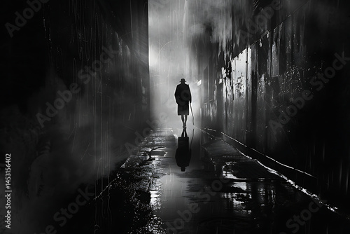 Solitary Figure Walking in Misty Dark Alley with Reflections and Suspenseful Atmosphere