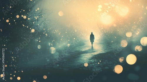 Solitary figure walking on a foggy path at sunset, surrounded by bokeh lights and snow.