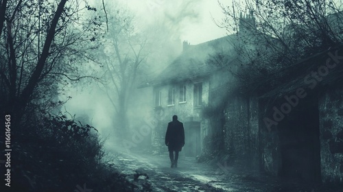 Solitary figure walking on a foggy road towards a mysterious house.
