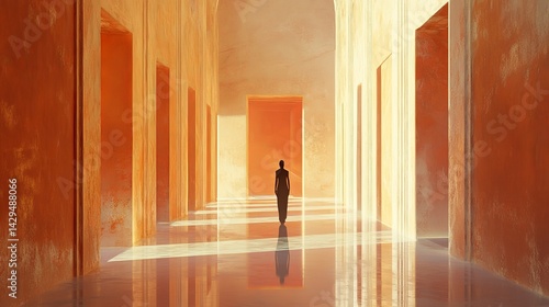 Solitary Figure Walking Reflective Orange Corridor Modern Architecture Minimalist Digital Art Peaceful Serene Ambiance Warm Golden Light Interior