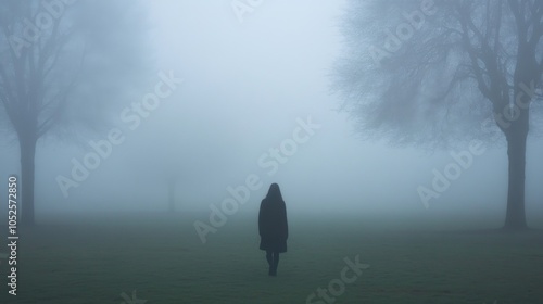 Solitary Figure Walking Through a Foggy Field