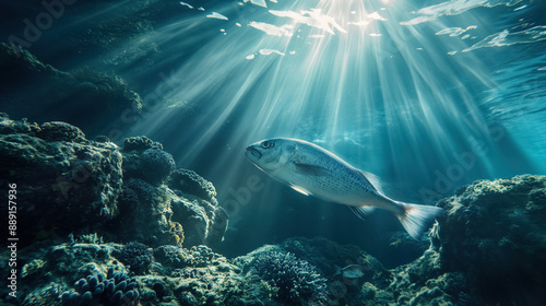 Solitary fish swimming through sunlit waters of an underwater coral reef, highlighting the beauty and tranquility of marine life.