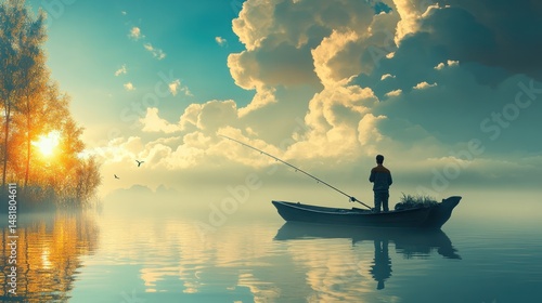 Solitary fisherman angling in tranquil lake illuminated by ethereal sunset colors