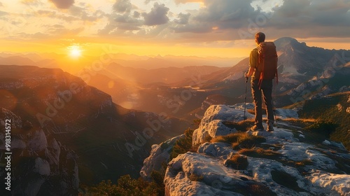 Solitary Hiker Admiring Majestic Mountain Sunset Panorama From Cliff Edge