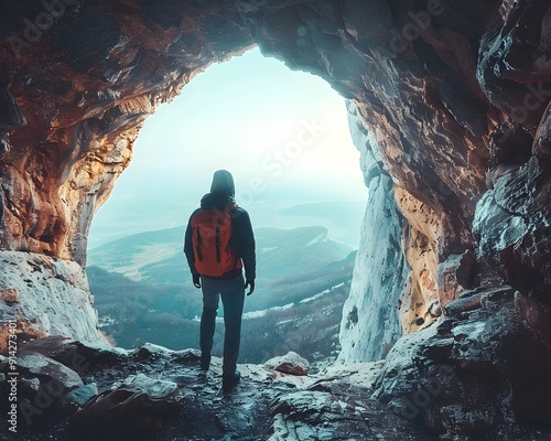 Solitary Hiker Exploring Mysterious Cave Amidst Rugged Terrain and Majestic Landscapes