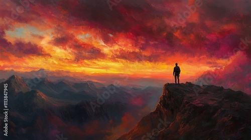 Solitary Hiker Overlooking Dramatic Mountainous Landscape Digital Art