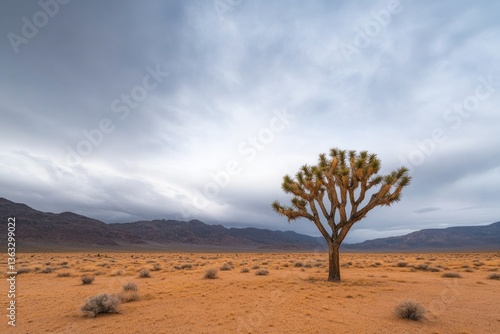 solitary joshua tree stands against expansive sunlit desert landscape shadows stretching far evoking timeless beauty