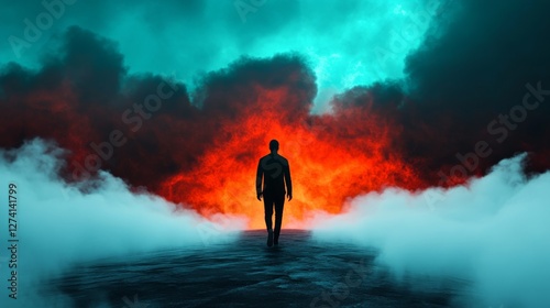 Solitary Journey Into the Inferno - A lone figure walks towards a fiery abyss, symbolizing courage, uncertainty, sacrifice, transformation, and destiny
