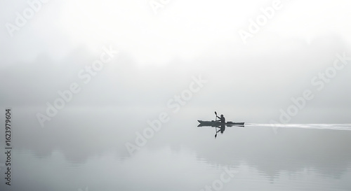 Solitary kayaker paddles through misty, tranquil waters, seeking peaceful adventure and quiet reflection