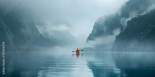Solitary Kayaker s Misty Fjord Journey Serene Reflection and Adventure Await in the Vast Rugged Landscape