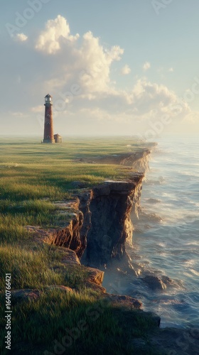 Solitary Lighthouse on Grassy Cliff Edge at Sunrise – Hyper realistic Minimalist Landscape with Ocean View and Volumetric Light
