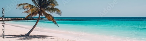 Solitary palm tree gracing a pristine sandy beach with azure ocean views