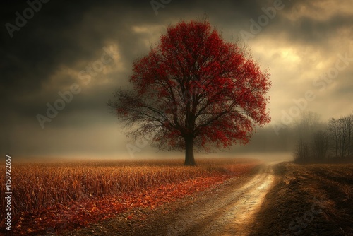 Solitary Red Tree in Autumn Mist