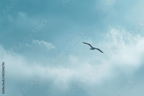 Solitary Seagull Soaring Through a Tranquil, Cloudy Sky.