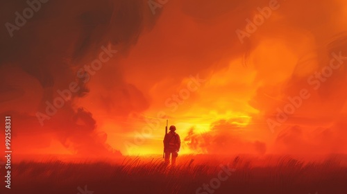 Solitary Soldier on a War-Torn Battlefield, a poignant portrayal of resilience and reflection, capturing the emotional aftermath of conflict in vibrant digital artistry.