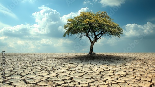Solitary Tree Against a Dry, Cracked Landscape Highlighting the Impact of Drought on Natural Environments and Land Quality