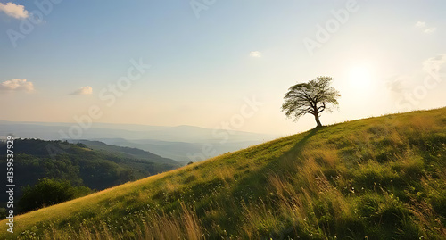 Solitary Tree at Sunrise on Rolling Hills