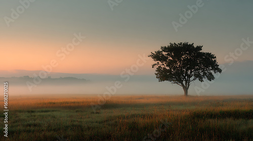 Solitary Tree in Foggy Field at Sunrise