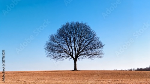 Solitary tree in vast field under bright blue sky.