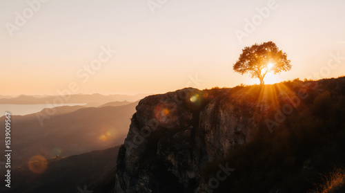 Solitary Tree on Cliff at Sunrise with Dramatic Sun Rays and Mountain View