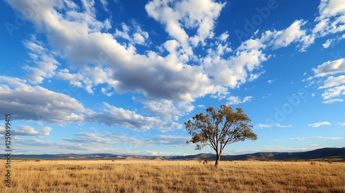Solitary Tree Standing Tall in an Open Field Under a Beautiful Sky with Fluffy Clouds and Blue Tones : Generative AI