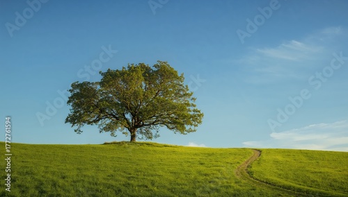 Solitary tree under a bright blue sky, green landscape, natural surroundings, sunny weather, pathway