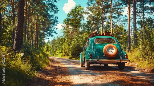 Solitary truck winds through verdant forest path, a lone vehicle amidst towering trees